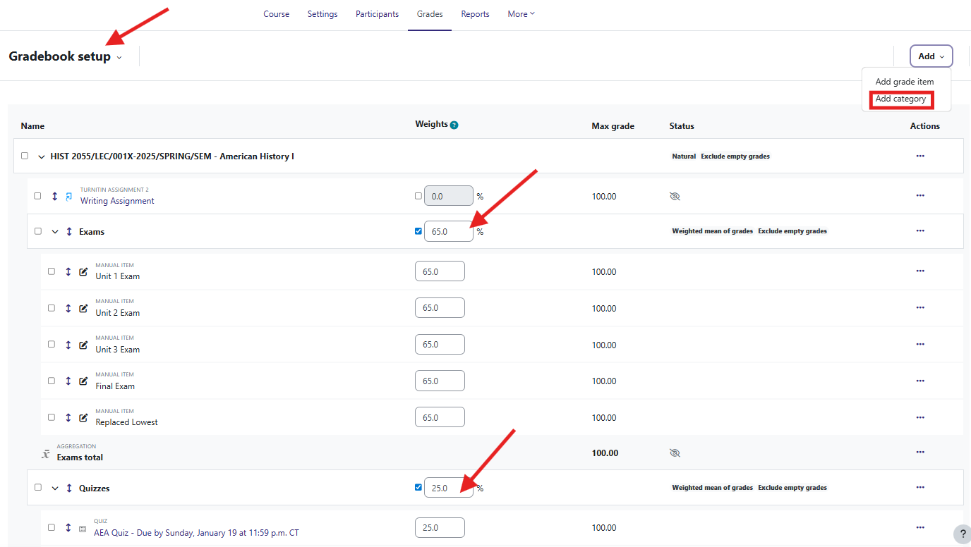 Each one of the above mentioned would be categories that would house the assignments intended to be measured for that particular topic. In the following example, I have made exams worth 65% of the student’s course grade while quizzes will contribute 25% to the overall course grade. Notice that these are FOLDERS not actual grade items.
