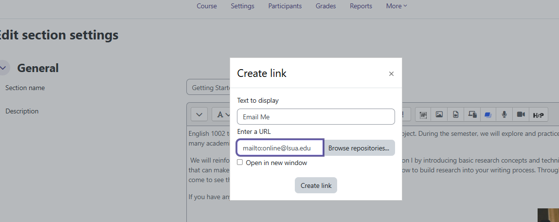 Paste username@lsua.edu with your email address and there are no spaces. You can apply a clickable name for the link - this is recommended for links to websites or content, not email addresses.